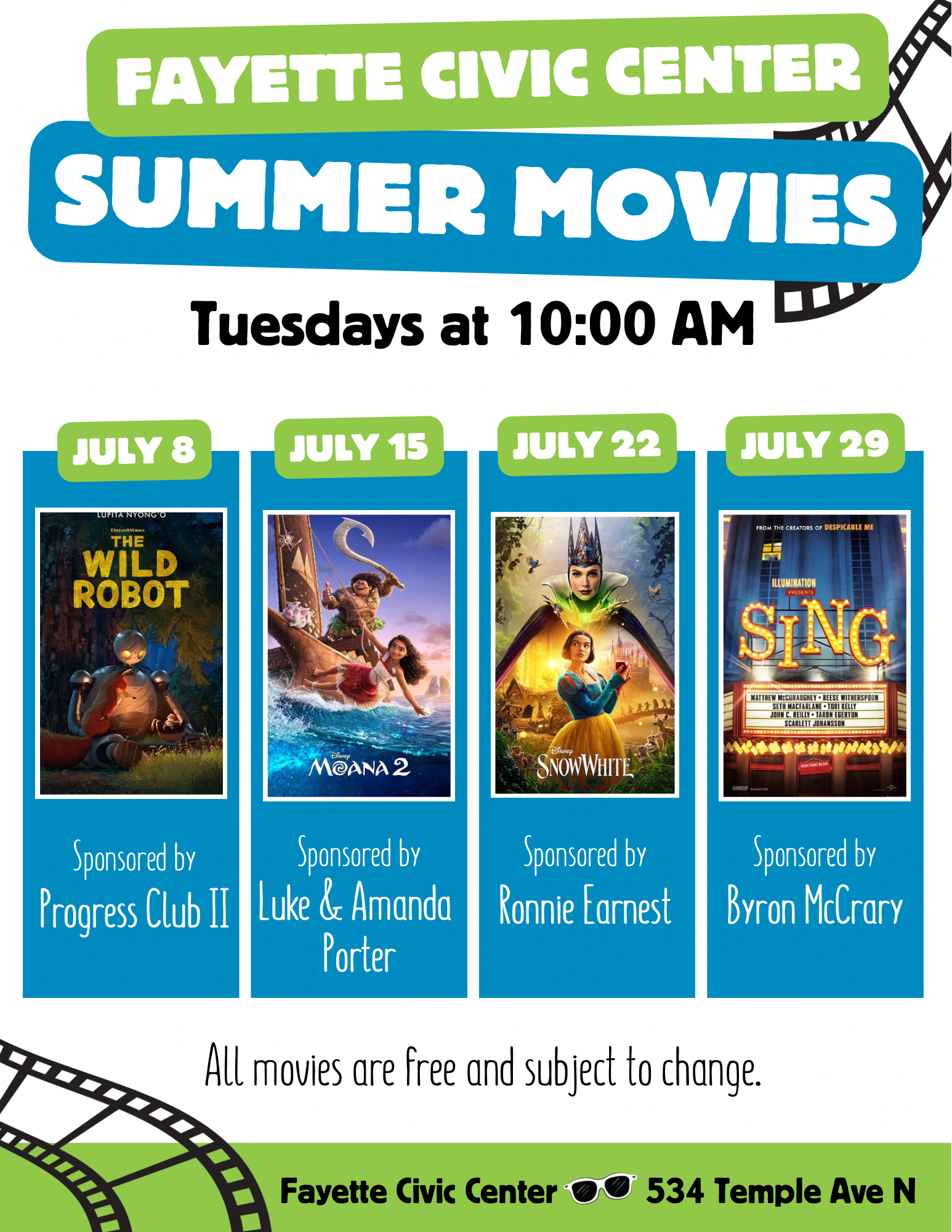 For additional information on events at the Civic Center or to host an event in any one of several rooms or the auditorium, please contact Glenda Robertson at 205-932-8727 or view their page on Facebook.